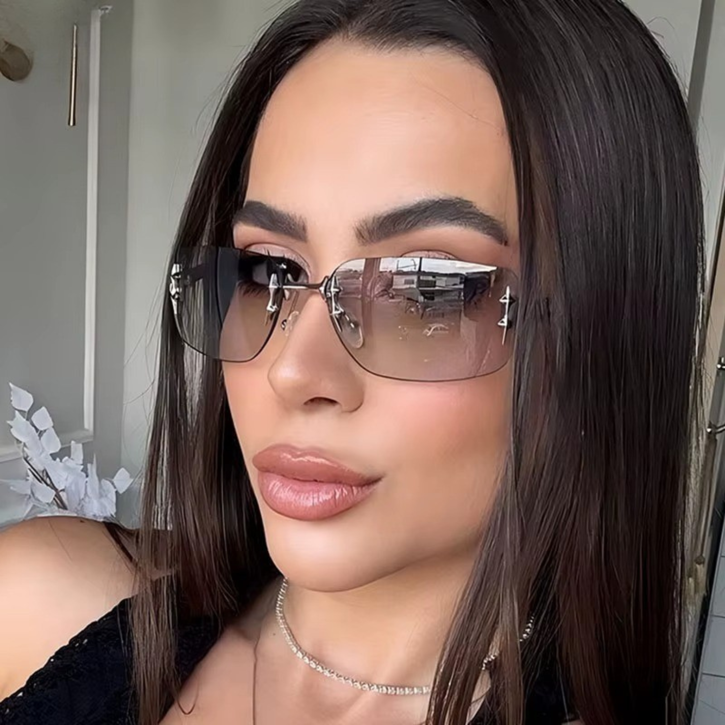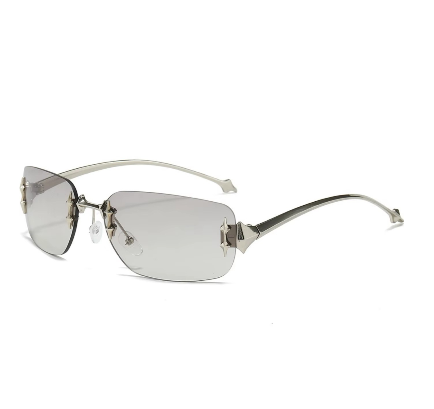 Sua estrutura rimless (sem bordas) minimalista, aliada a detalhes metálicos inspirados em constelações, proporciona um visual leve e sofisticado.